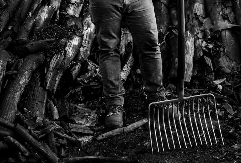 L’accensione avviene dall’alto, con i tizzuni ardenti, e da quel momento inizia una lenta e paziente metamorfosi. Per circa quindici giorni, i carbonai vegliano giorno e notte sulla carbonaia: osservano il fumo, ascoltano il respiro del fuoco, “nutrono” la brace con altra legna. Un gesto antico, compiuto con una devozione quasi religiosa, come se si trattasse di un essere vivente.